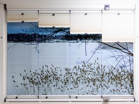 Asennetaan lasiin. Tuote tulee lasin ja seinän väliin.